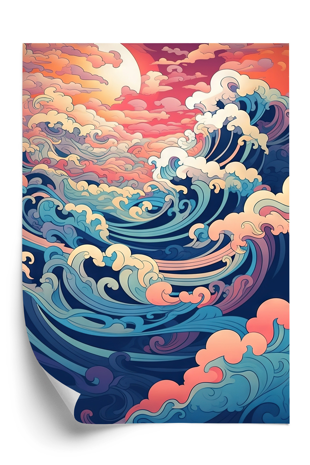Poster Abstrakte Landschaft Mit Meereswellen Und Sonnenuntergang