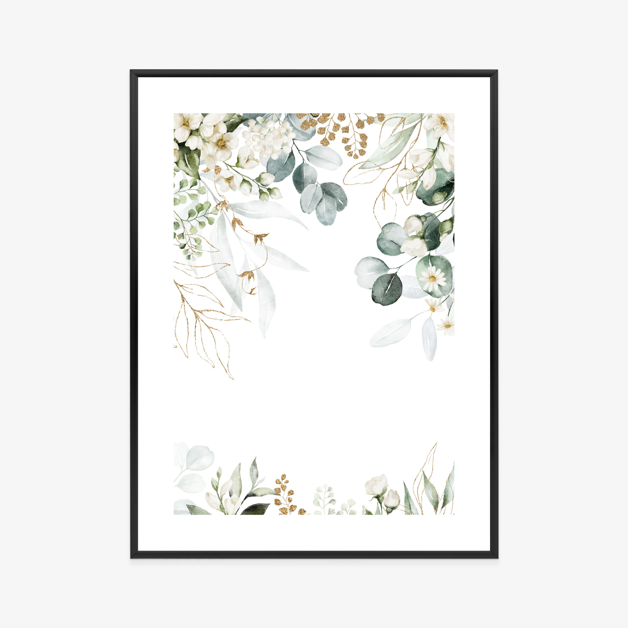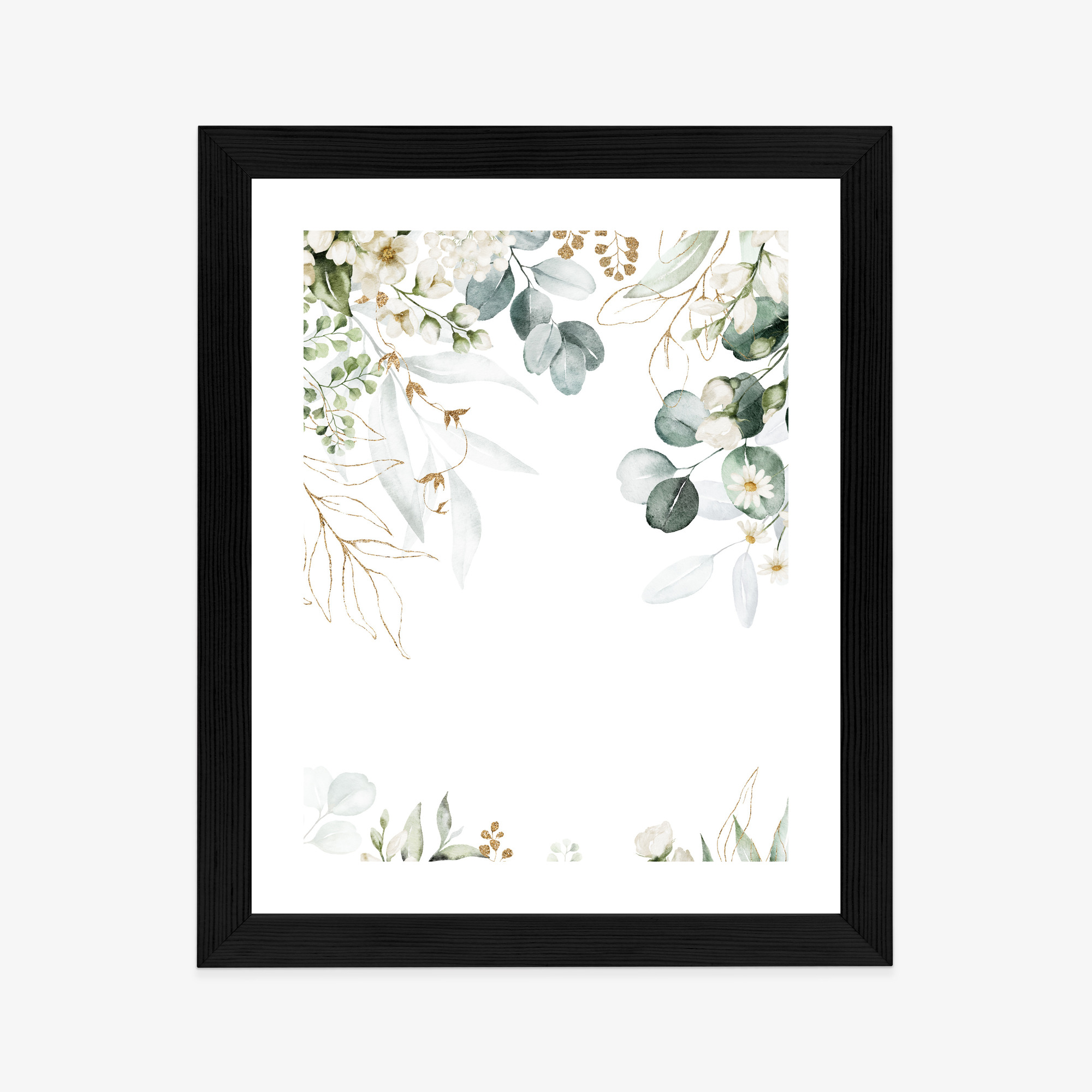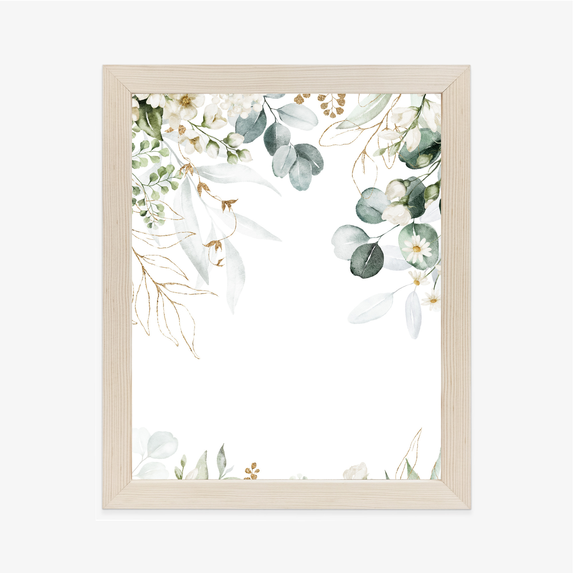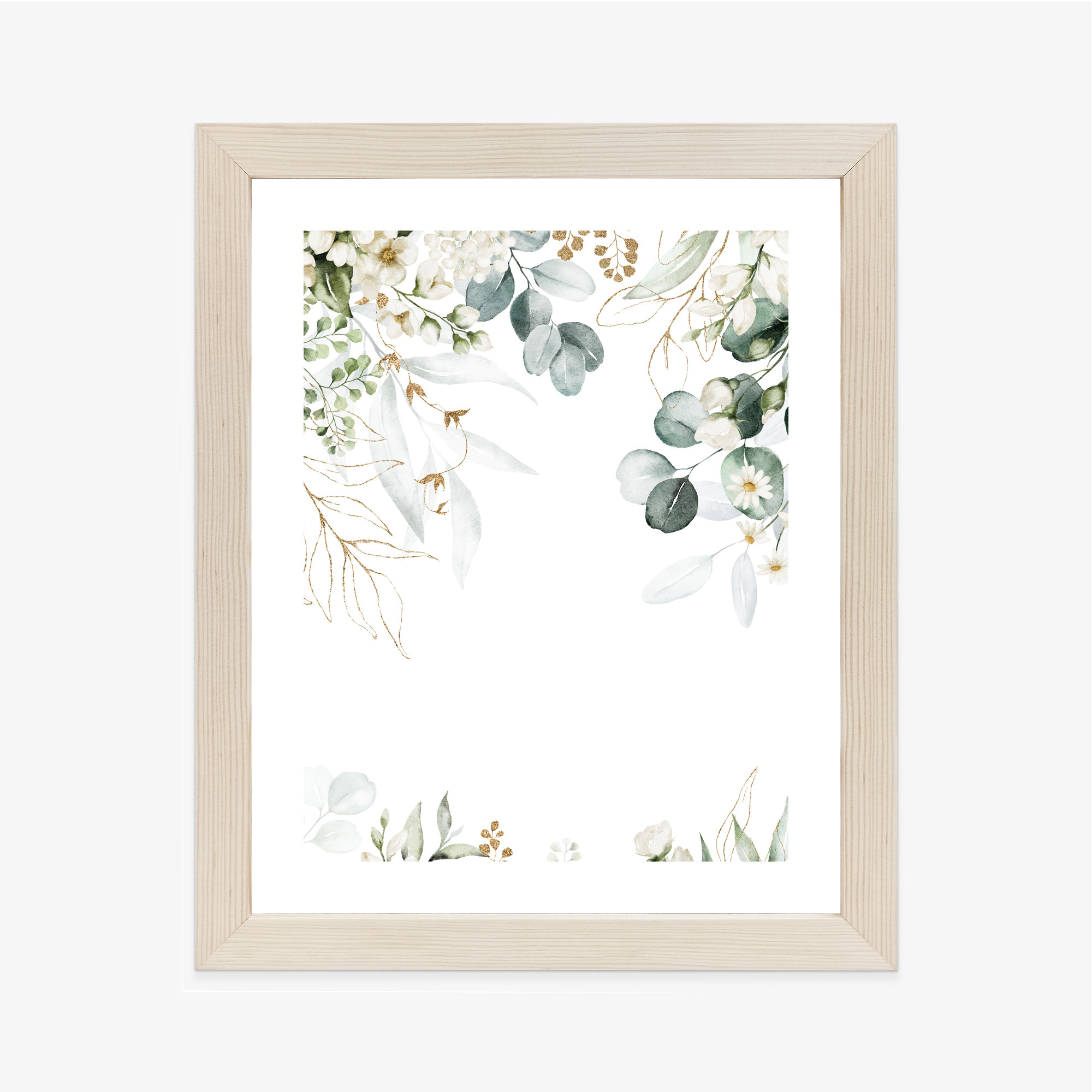 Poster Aquarell Aus Eukalyptusblättern Und Weißen Blüten Rahmen Holz Mit Passepartout Farbe Natürlich