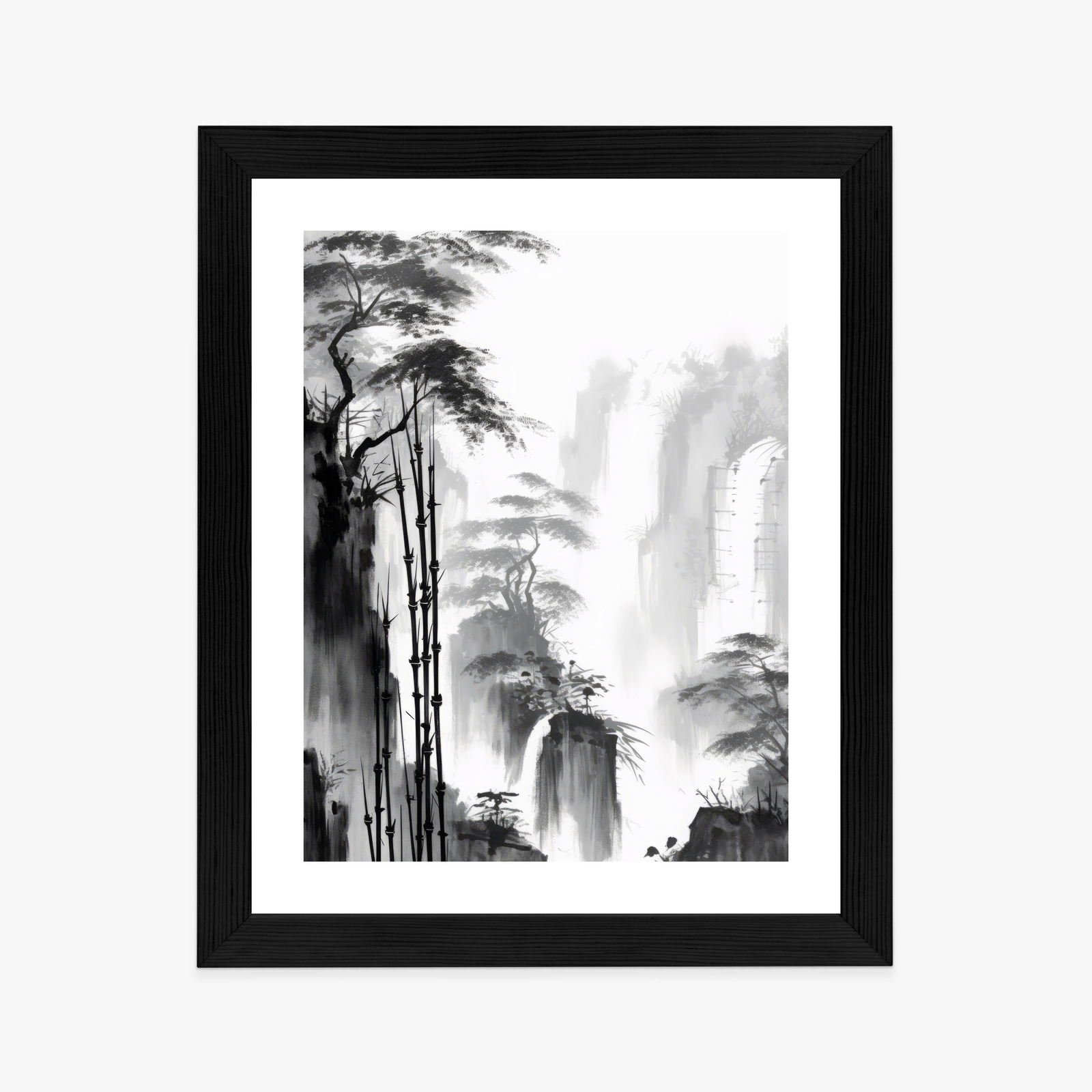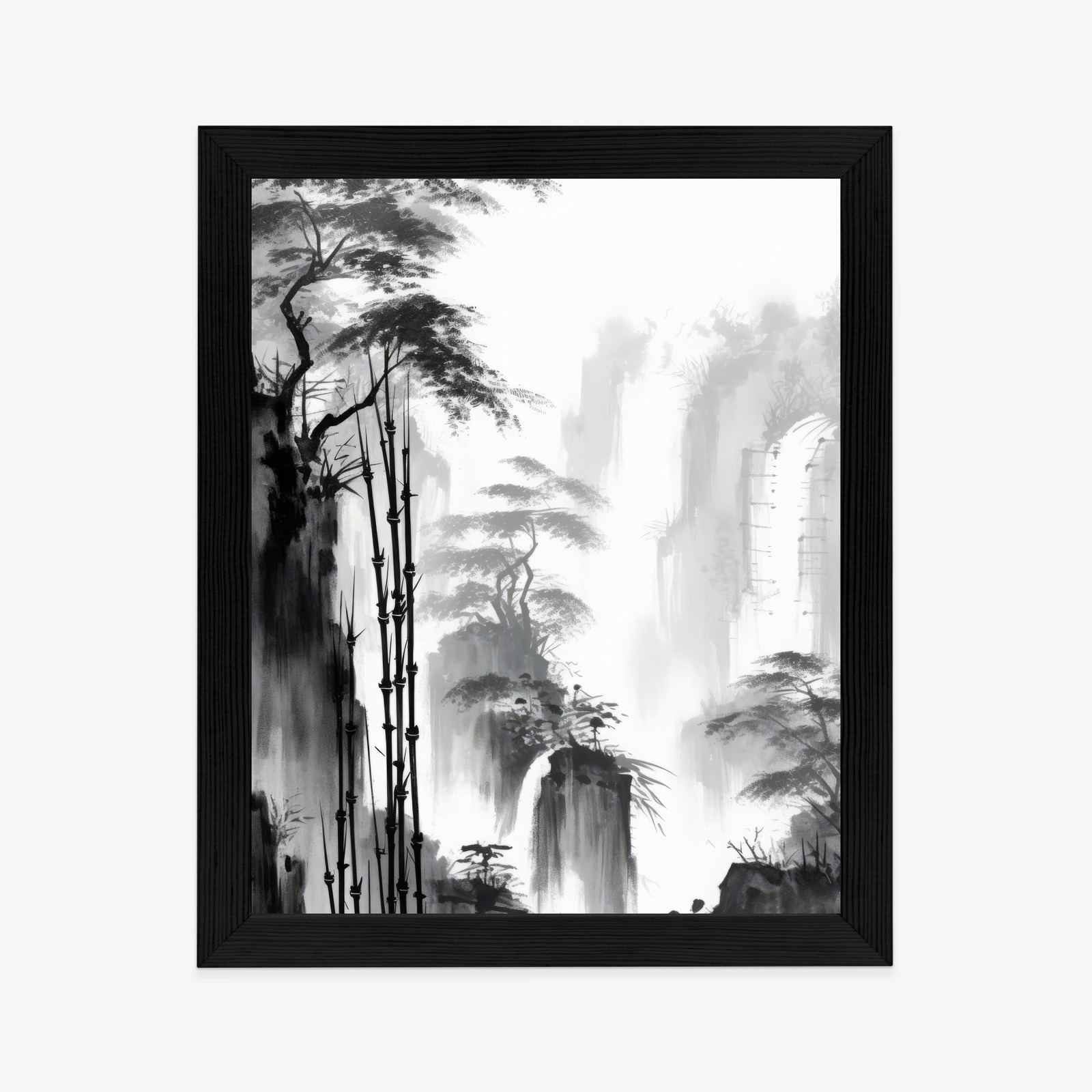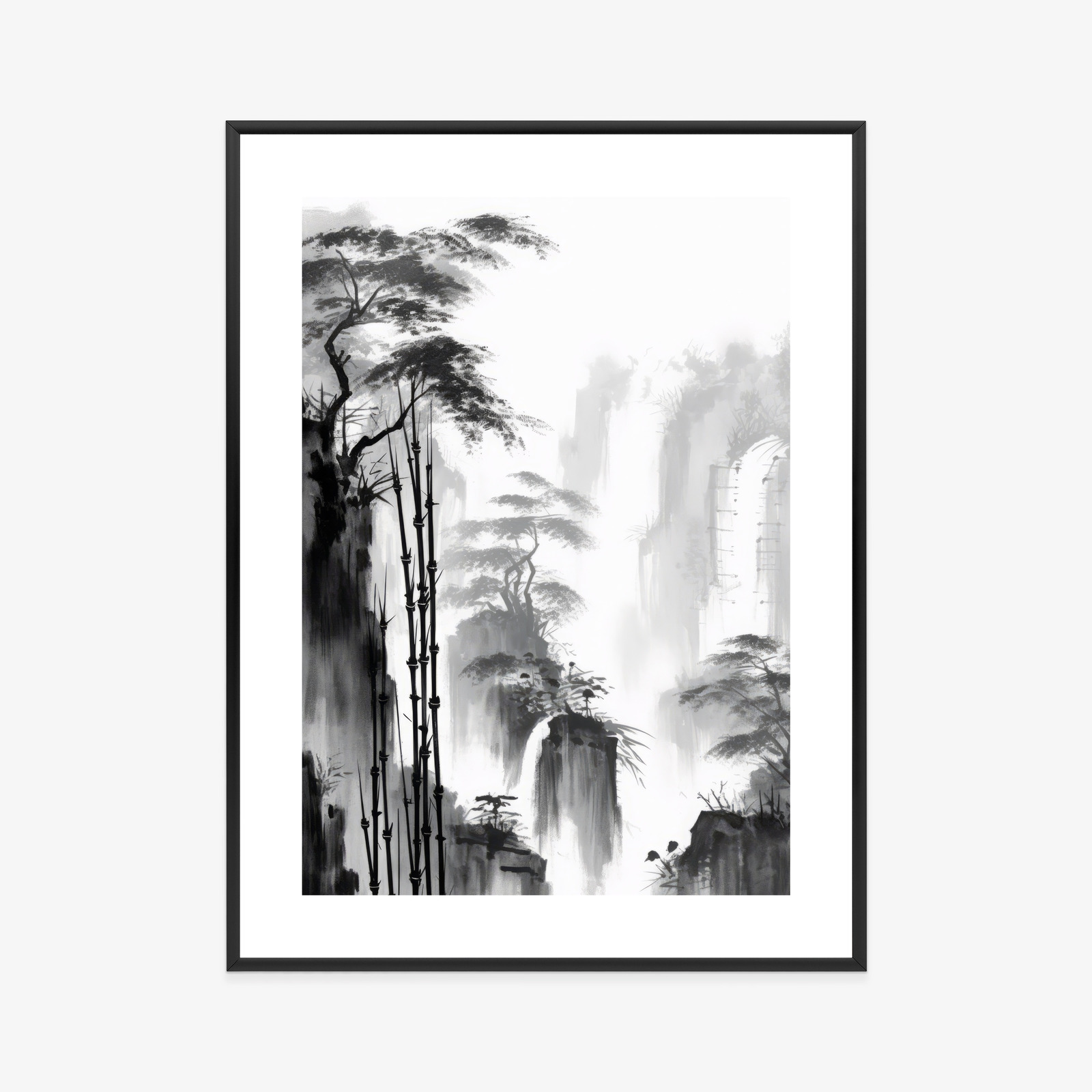 Schreibe die erste Rezension für „Poster Berglandschaft Mit Wasserfall Und Hohen Bambusbäumen Rahmen Holz Mit Passepartout Farbe Natürlich“