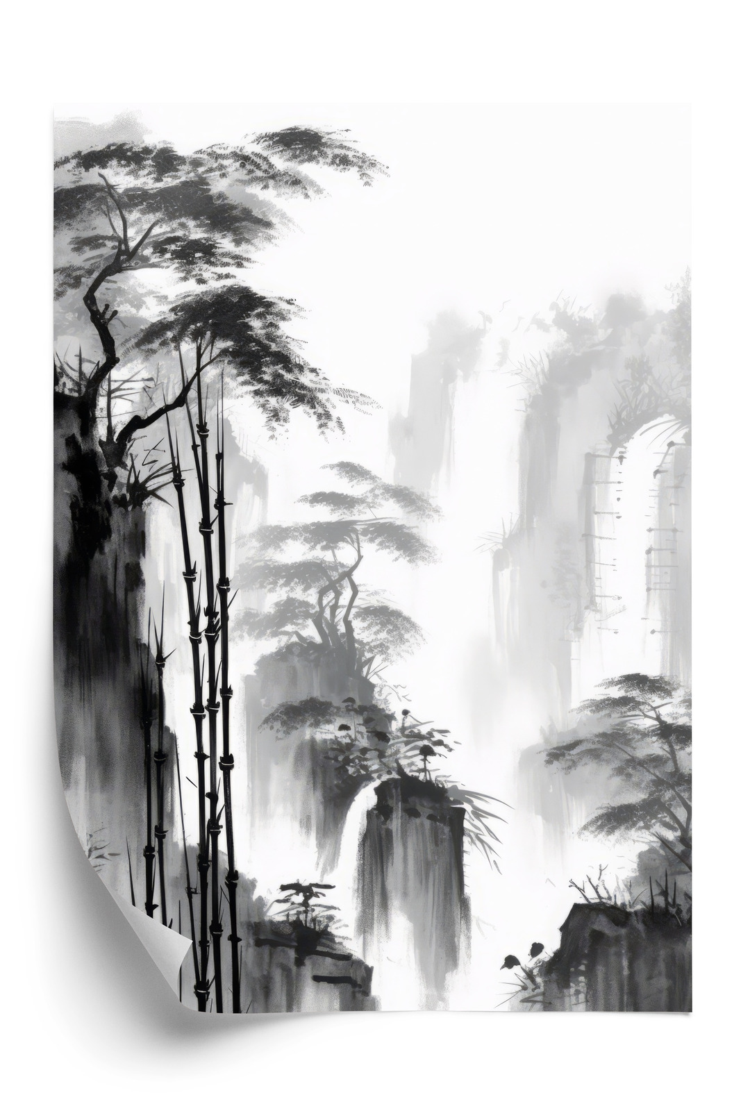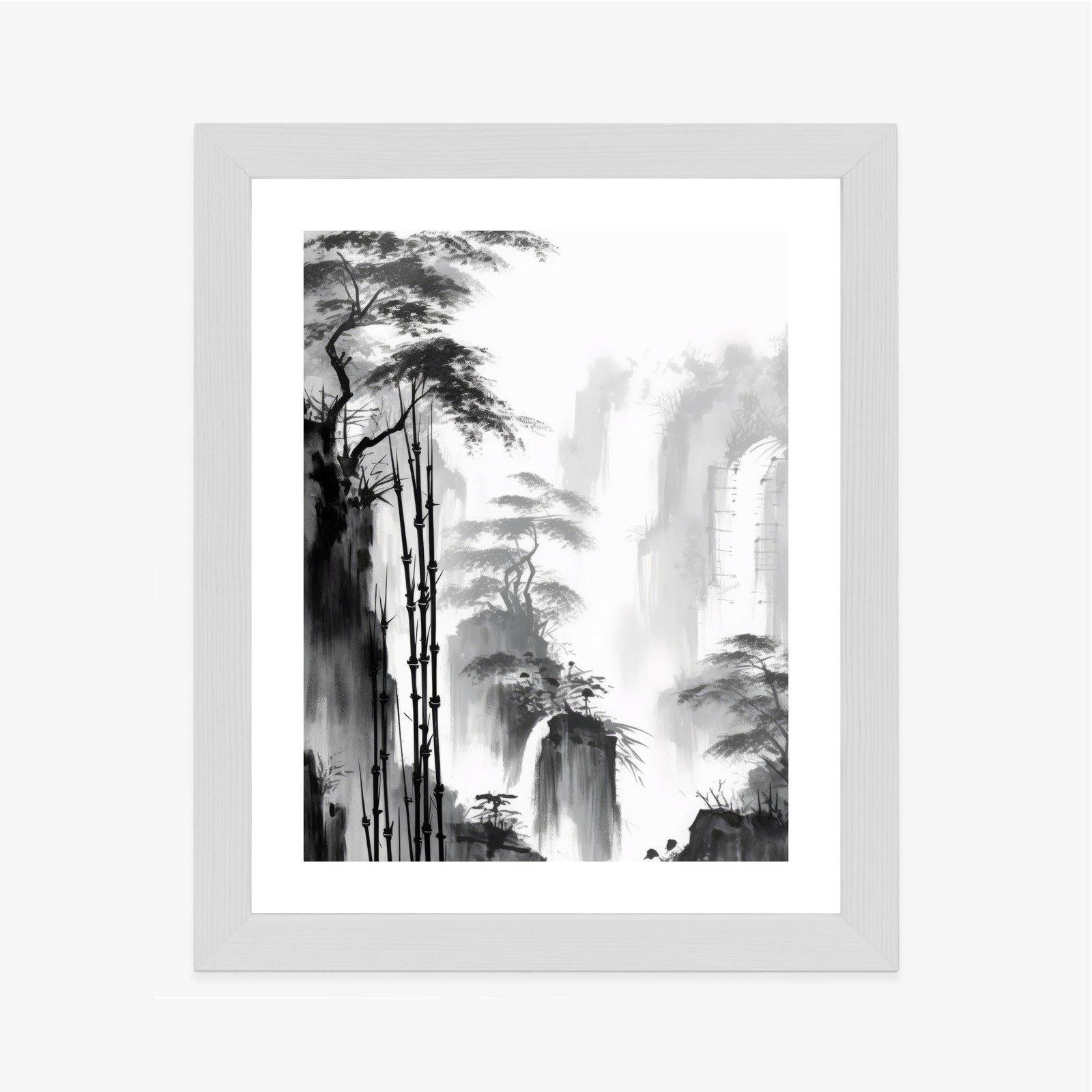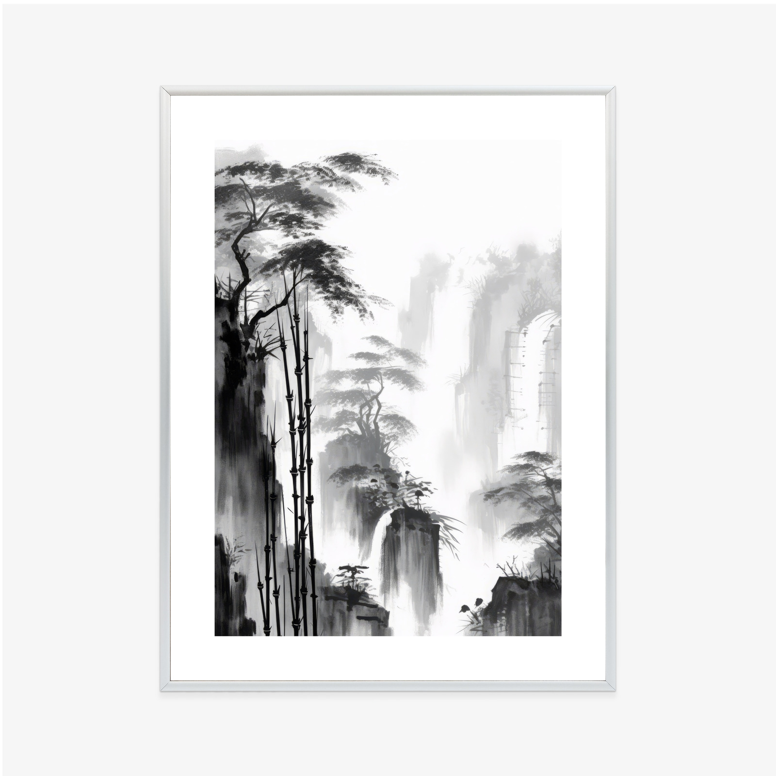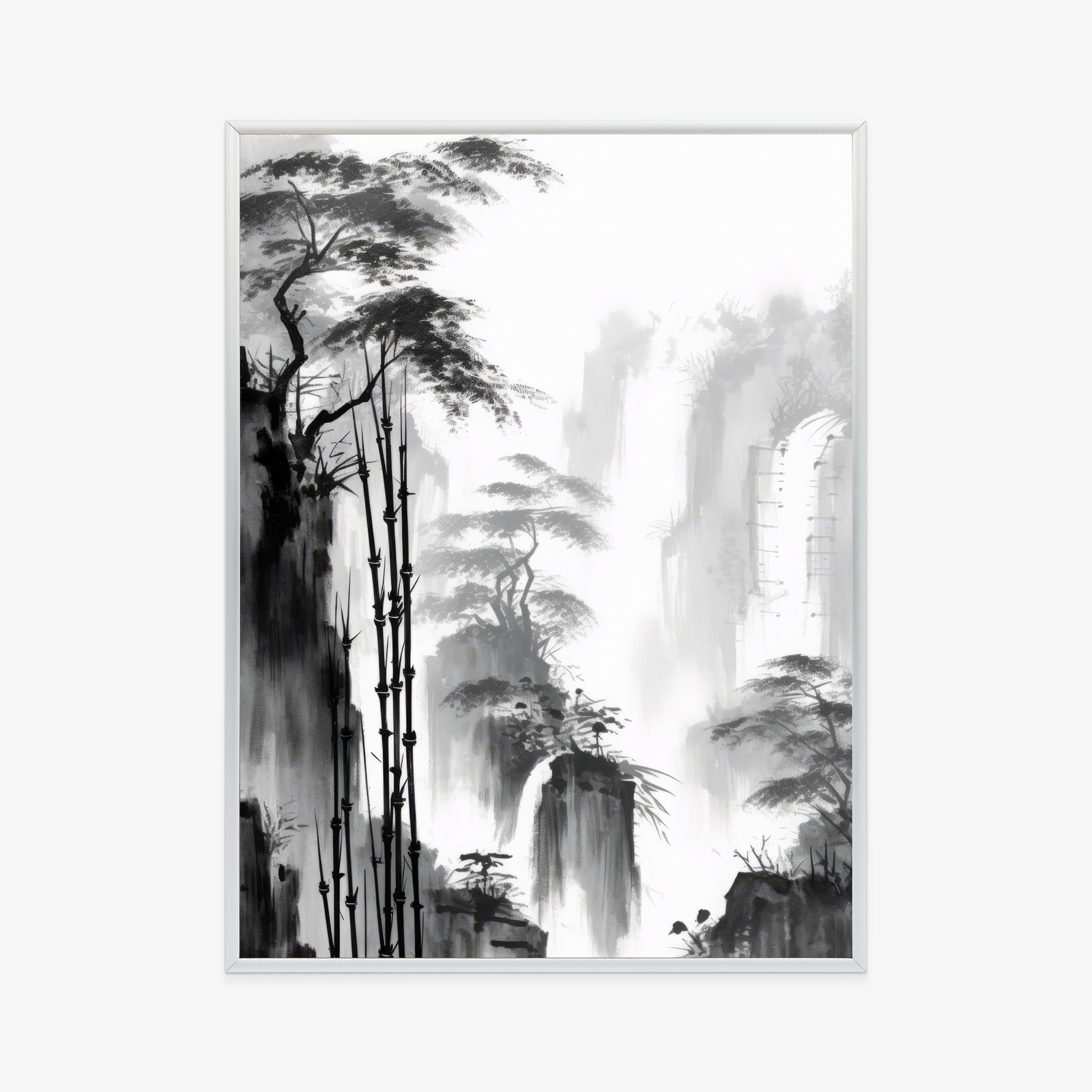 Schreibe die erste Rezension für „Poster Berglandschaft Mit Wasserfall Und Hohen Bambusbäumen Rahmen Holz Mit Passepartout Farbe Natürlich“