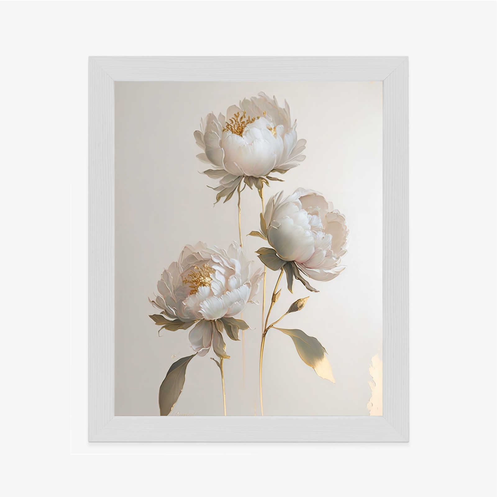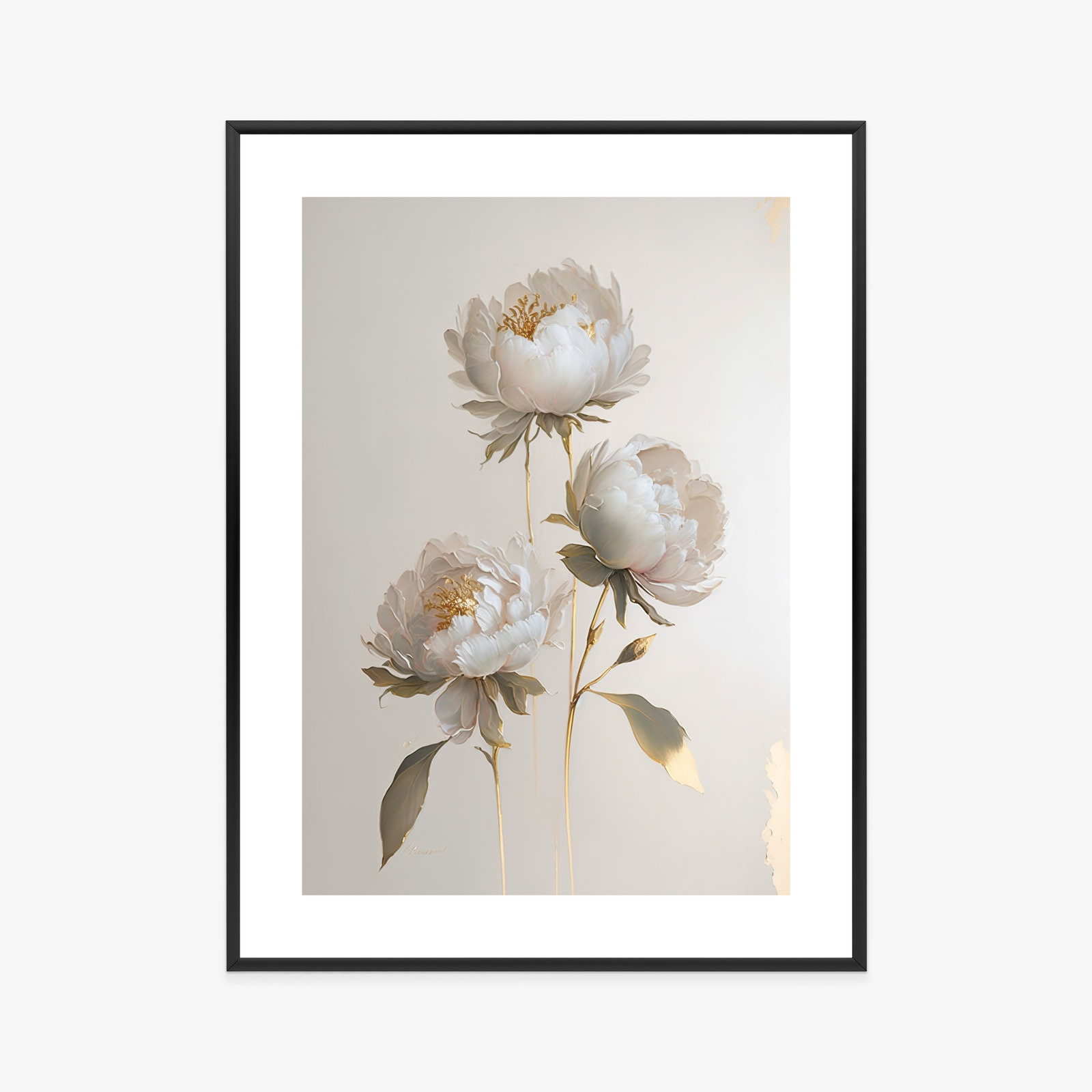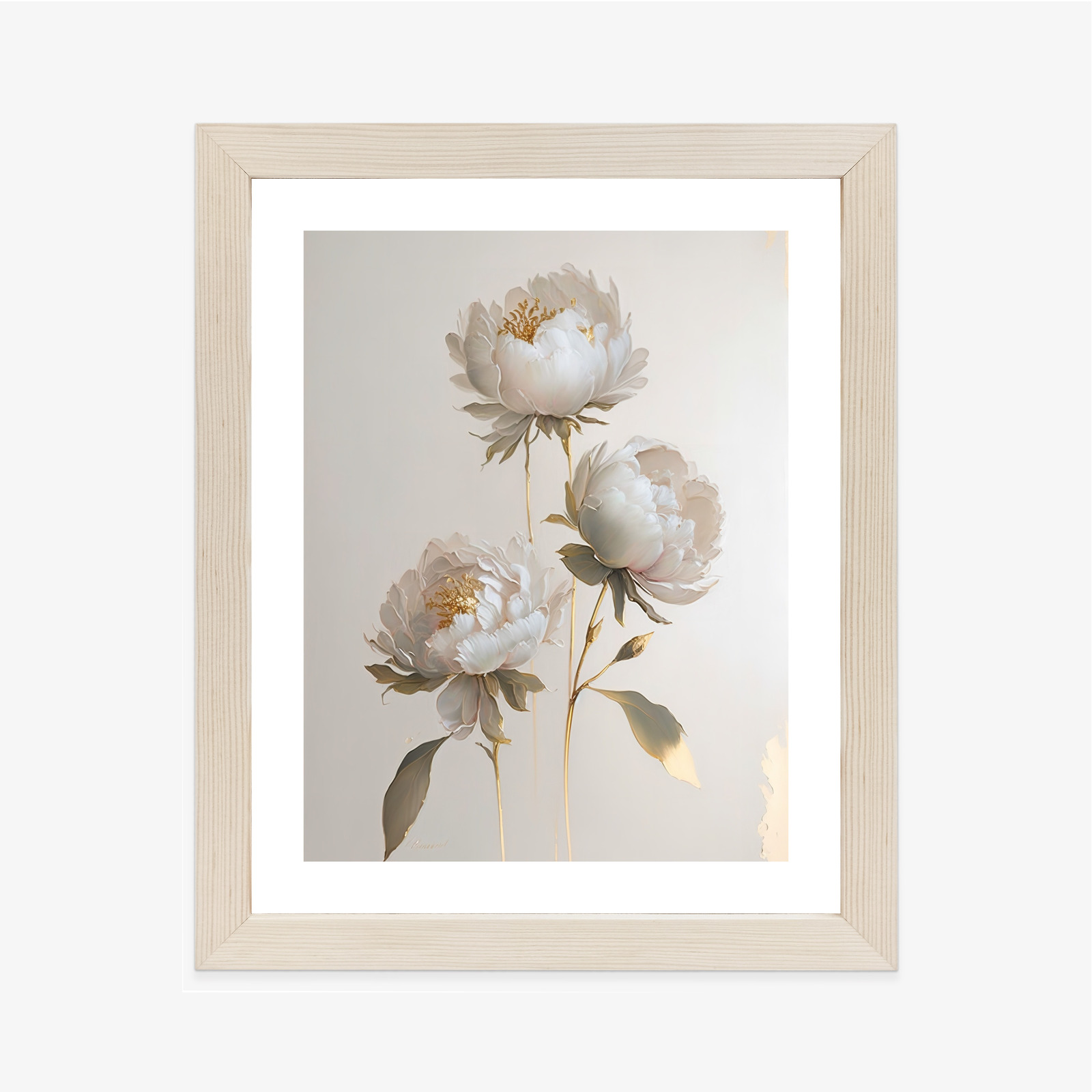 Poster Weiße Pfingstrosen Auf Hellem Hintergrund Und Goldenen Elementen Rahmen Holz Mit Passepartout Farbe Natürlich